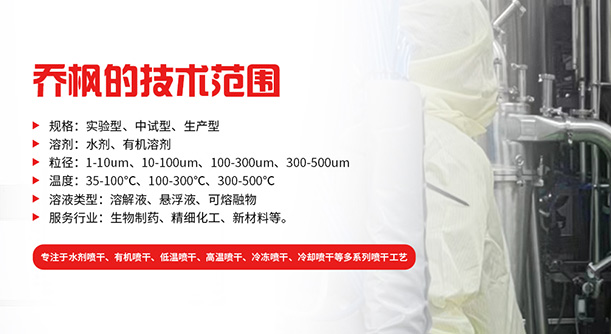 上海喬楓實業有限公司,成立于2012年,是從事噴霧干燥設備的研發設計、生產、銷售(小型噴霧干燥機實驗型噴霧干燥機,35℃低溫噴霧干燥機,有機溶劑噴霧干燥機,低溫閉式循環噴霧干燥機、超細粉末噴霧干燥機噴霧冷凍干燥機、真空噴霧干燥機、氣流噴霧干燥機噴霧造粒干燥機,離心噴霧干燥機,沸騰制粒機等)和售后于一體的綜合性公司,本公司現成為一家致力于為生物制藥、精細化工、新能源、陶瓷造粒及食品工程等領域提供全套解決方案的整線交鑰匙工程企業。